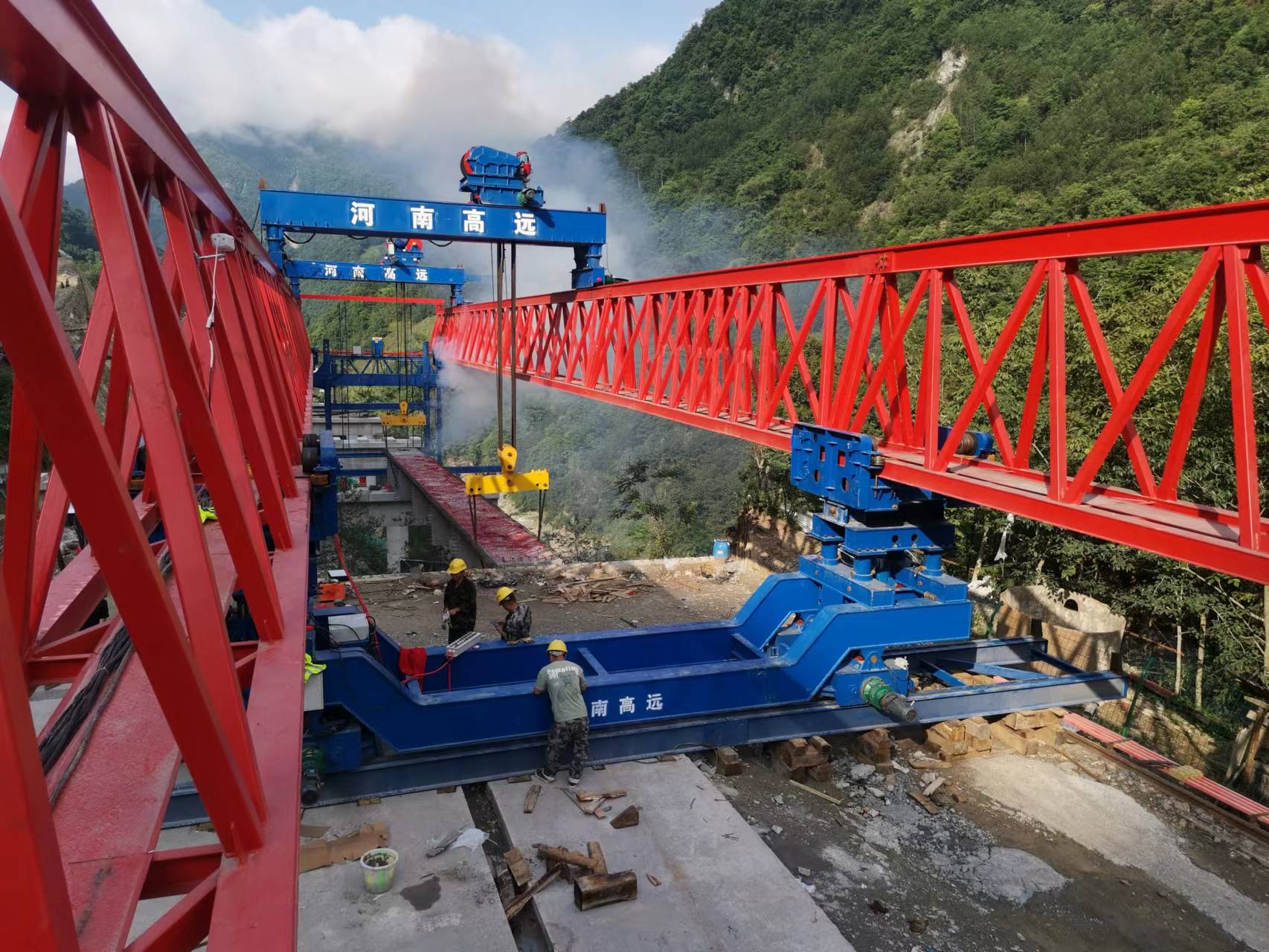 架橋機主要由主梁、懸臂梁、下導(dǎo)梁、前后支腿、輔支腿、吊梁行車、懸臂吊及電液系統(tǒng)組成。適用于三種不同跨徑單跨簡支梁的架設(shè),作業(yè)效率高。本類型架橋機能夠架設(shè)直線、曲線、縱坡的等跨及變跨雙線預(yù)應(yīng)力混凝土整孔箱梁。該 架橋機除了能夠進行標(biāo)準(zhǔn)架設(shè)作業(yè)外,還能滿足首末跨架設(shè)、曲線架設(shè)、變跨架設(shè)、跨連續(xù)梁、結(jié)合梁、連續(xù)鋼構(gòu)等。既有橋梁架設(shè)、簡支變跨連續(xù)架設(shè)等工況施工。具有簡支架設(shè)、定點起吊、梁體吊裝穩(wěn)定性好、作業(yè)效率高、安全可靠、變跨調(diào)整方便、操作方便等特點。